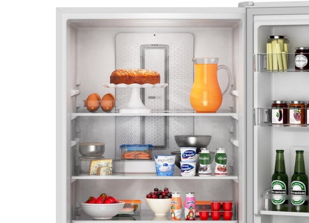 O sistema duplo evaporador garante que não haja contaminação de odores entre refrigerador e freezer. Além disso, o ar frio é distribuído de maneira uniforme por dutos laterais, evitando pontos de aquecimento no interior.